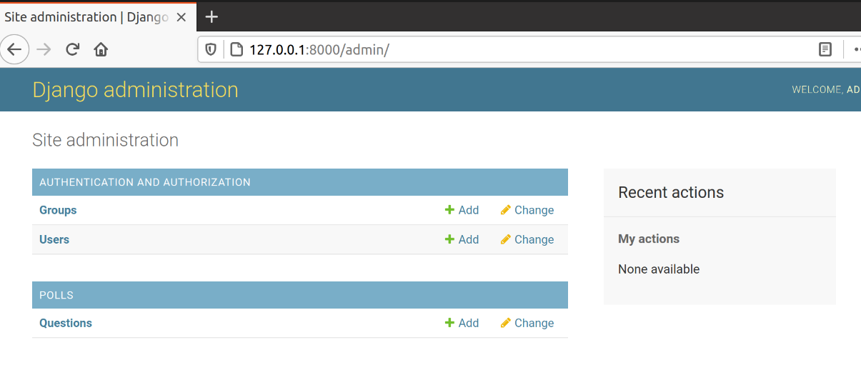 Question 을 등록시켰으니 Django 는 이를 알아채고 관리 인덱스 페이지에 이를 표시할 것