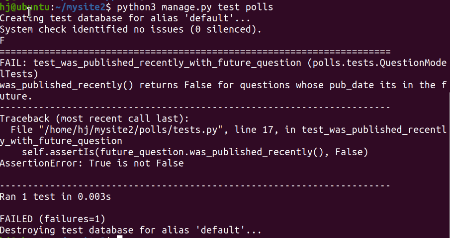 Question.was_published_recently() 메소드는 Question이 어제 게시된 경우 True를 반환(올바른 동작)할 뿐만 아니라 Question의 pub_date 필드가 미래로 설정되어 있을 때도 그렇습니다(틀린 동작).
