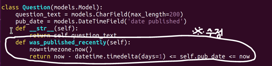 models.py에서 날짜가 과거에 있을 때에만 True를 반환하도록 메소드를 수정해야 한다.